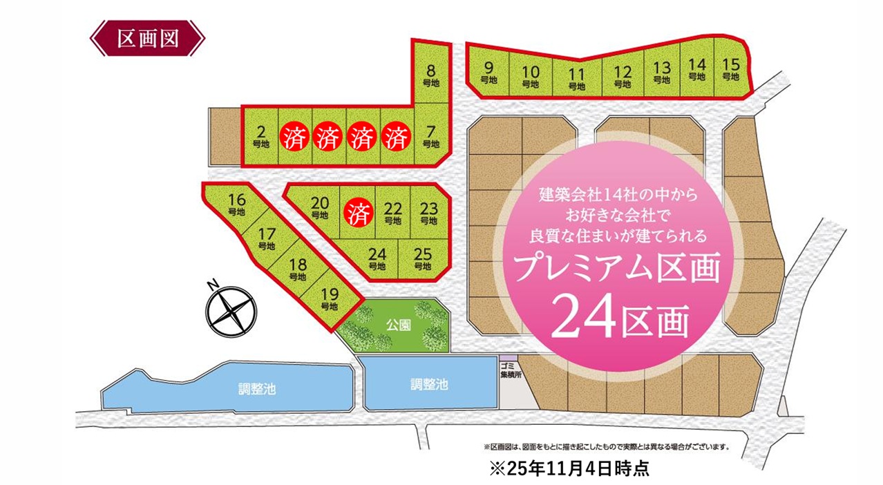 ■建築条件付宅地/土地売買契約締結後、3ヶ月以内に提携建築会社と住宅の建築請負契約を締結して頂くことを条件に土地を販売するものです。この期間内に住宅を建築しないことが確定した時、または建築請負契約が成立しなかった場合、土地売買契約は白紙解約となり、受領した金員は全額無利息にて返却致します。