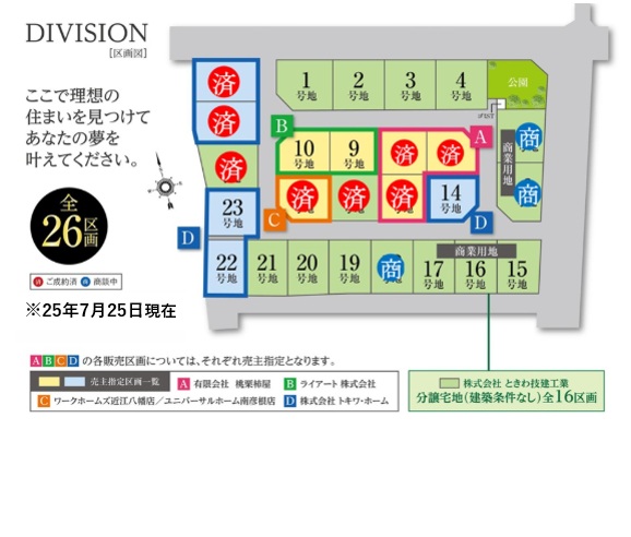 ■取引態様/売主:[1~4·12·13·18~21·24号地]株式会社ときわ技建工業〈滋賀県犬上郡豊郷町安食南350‐11トキワ社屋2F‐B、TEL0749-35-0505、宅建業番号/滋賀県知事 第3790号〉